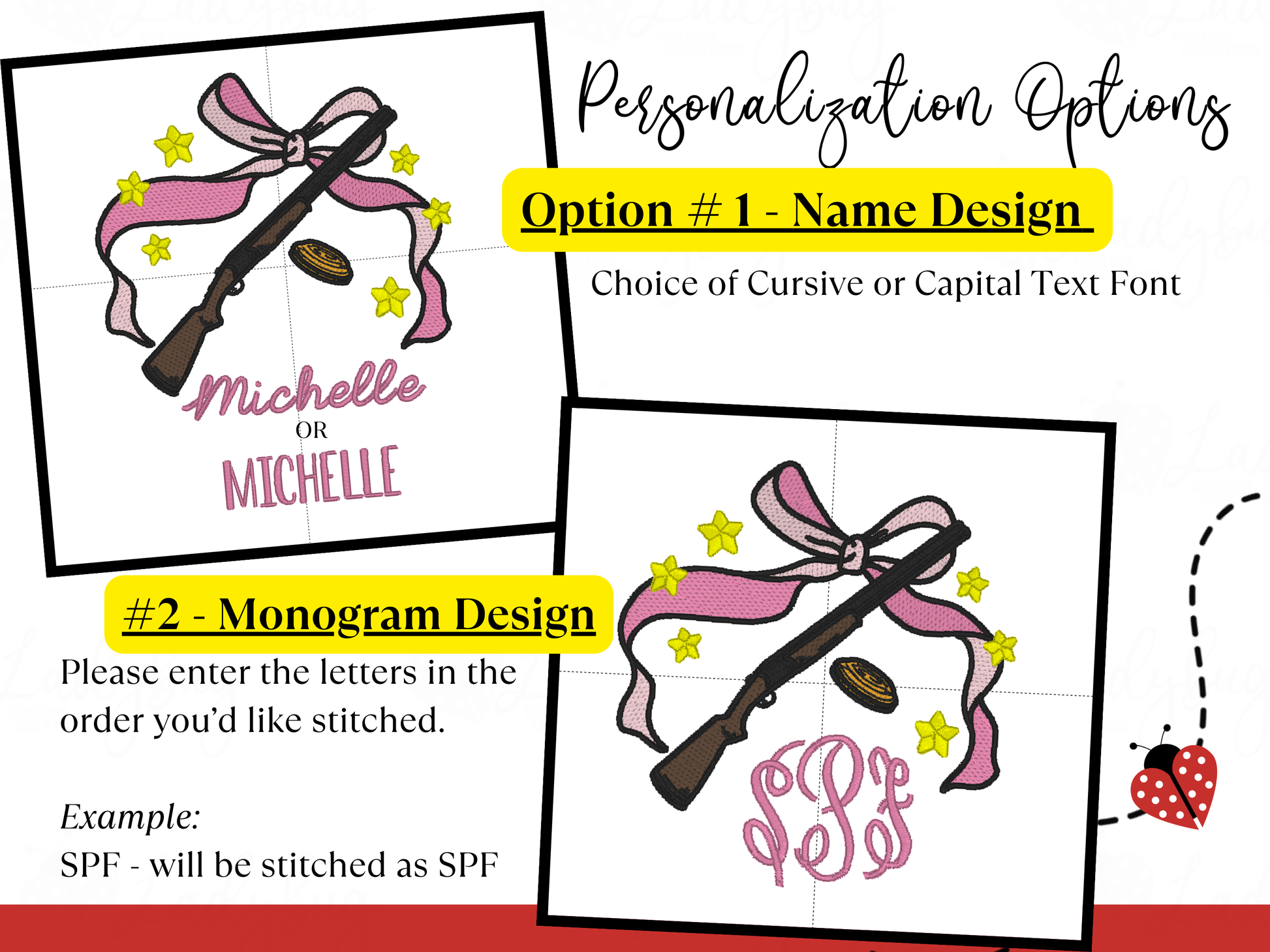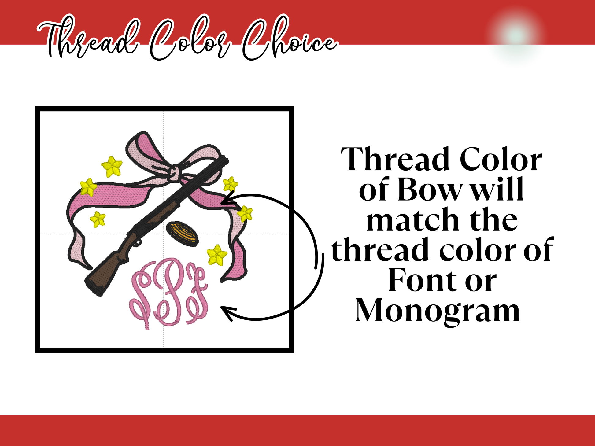 Your monogram or name is embroidered on the opposite chest from the design, and the bow thread color perfectly matches your chosen personalization for a coordinated, feminine, sporty look.